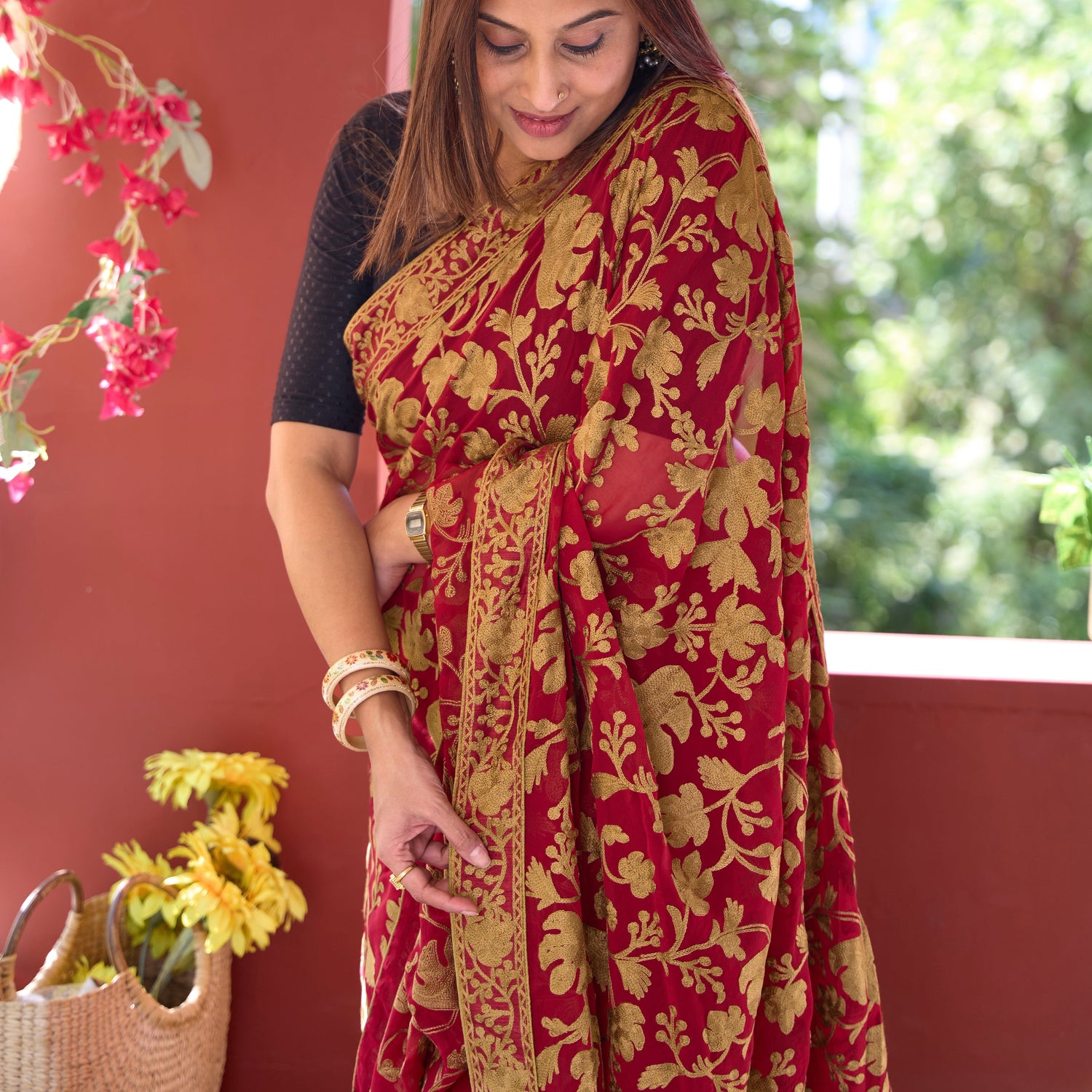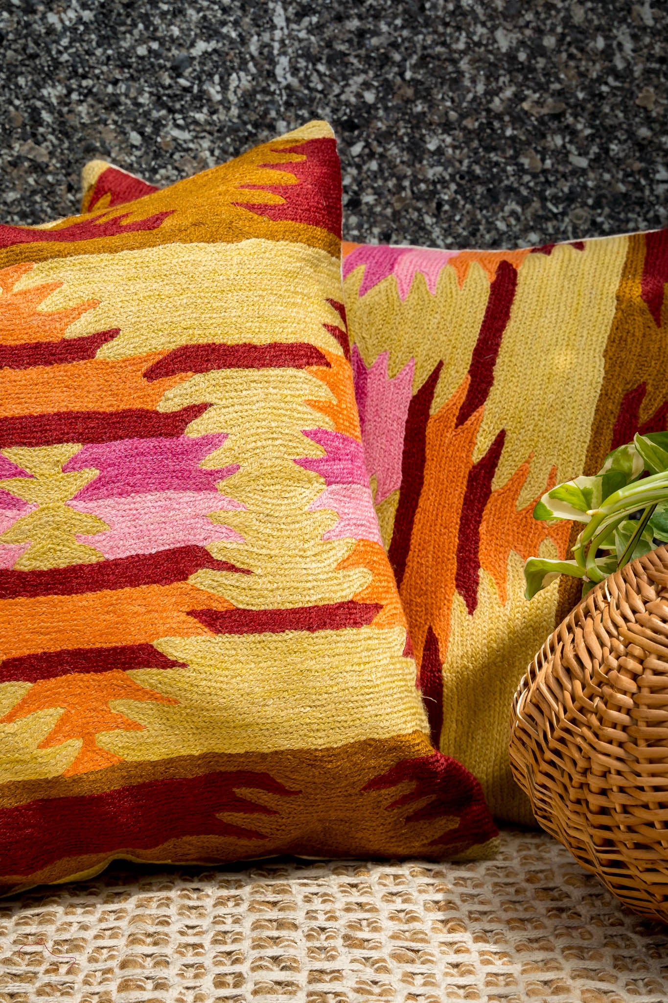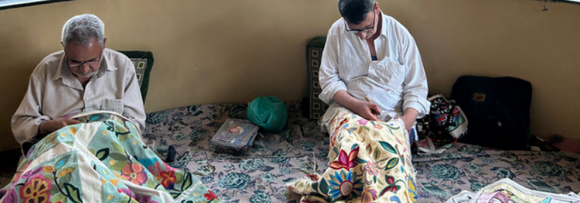 Our artisans in Kashmir specialize in unique chain-stitch embroidery, covering large areas on pure cotton bases to create an embossed effect on upholstery and drapery.