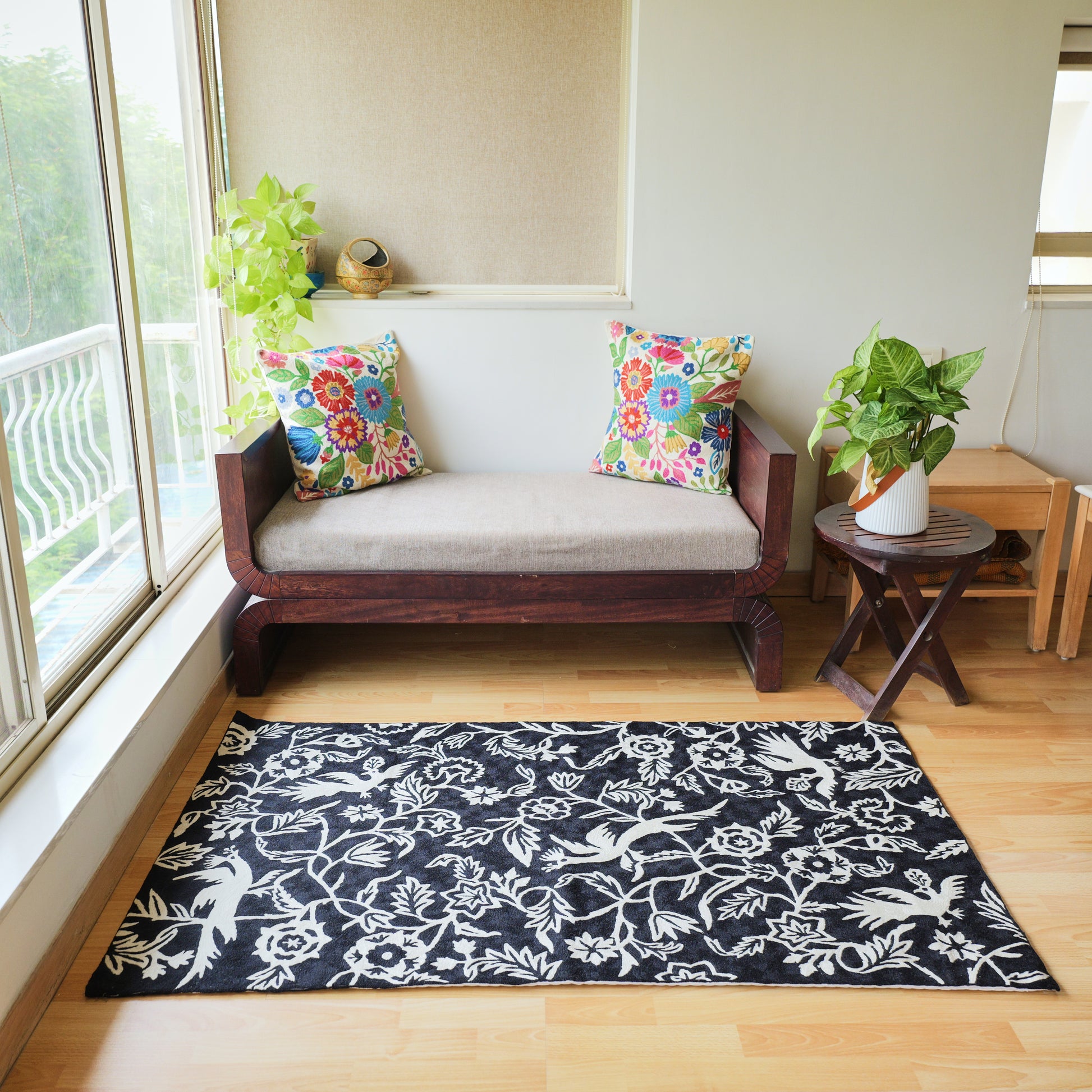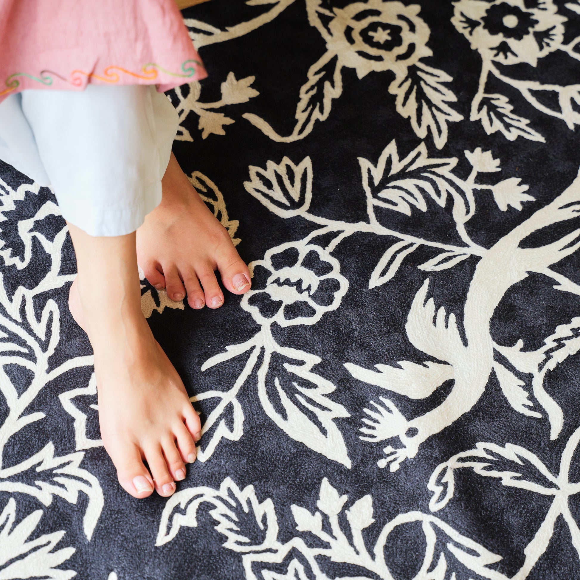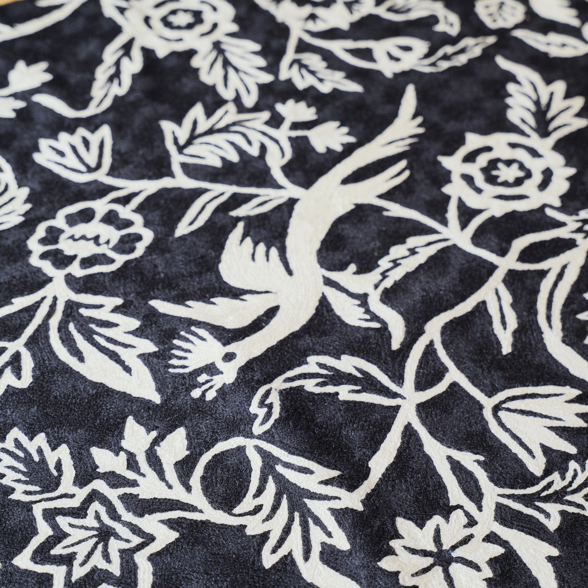 This beautiful handmade chain-stitch floor rug is made from wool thread embroidery on cotton base by our skilled craftsmen in Kashmir.