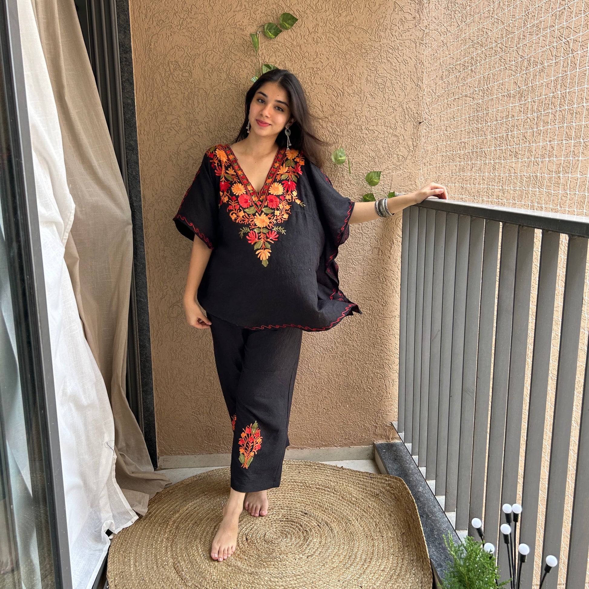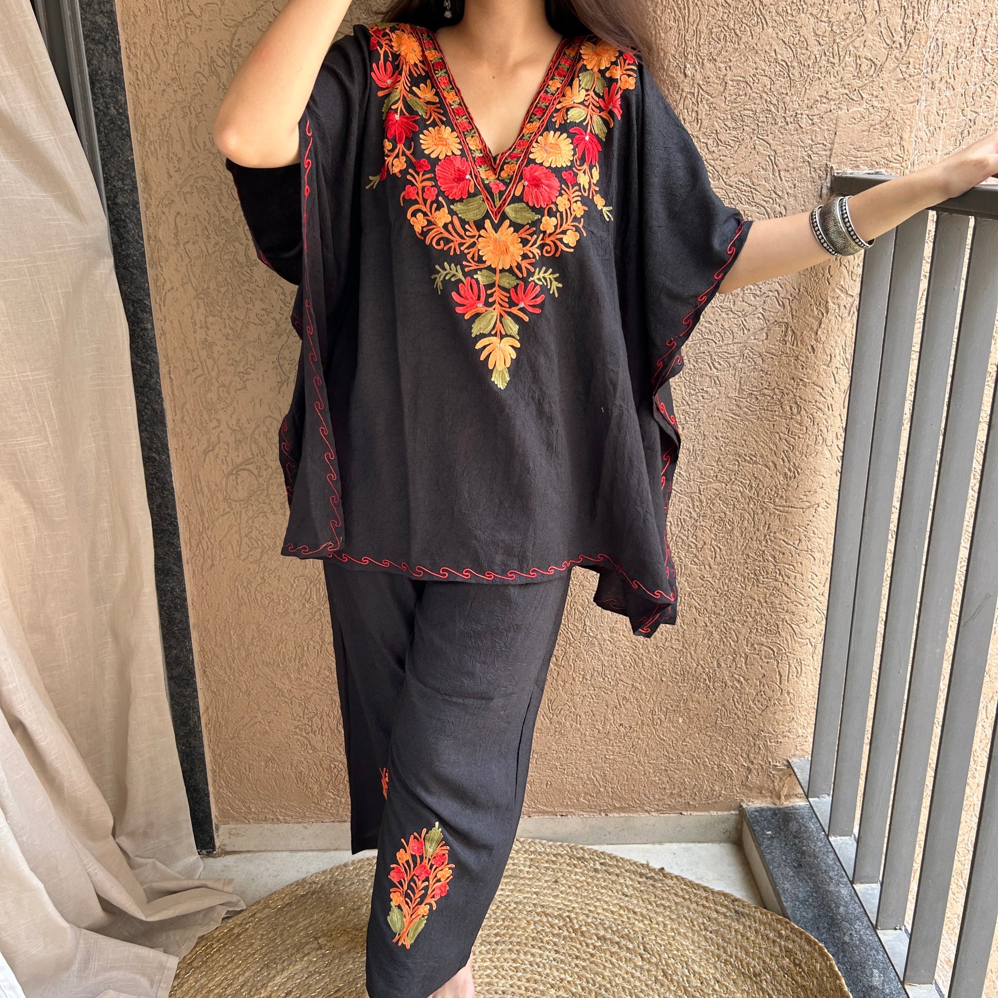 Our Kashmiri Kaftan Coord Sets seamlessly blend traditional craftsmanship with contemporary flair. The kaftan features exquisite Kashmiri embroidery, showcasing intricate patterns, while the coordinating pants provide a stylish and comfortable complement. This ensemble is the perfect choice for a variety of occasions, offering both elegance and ease.