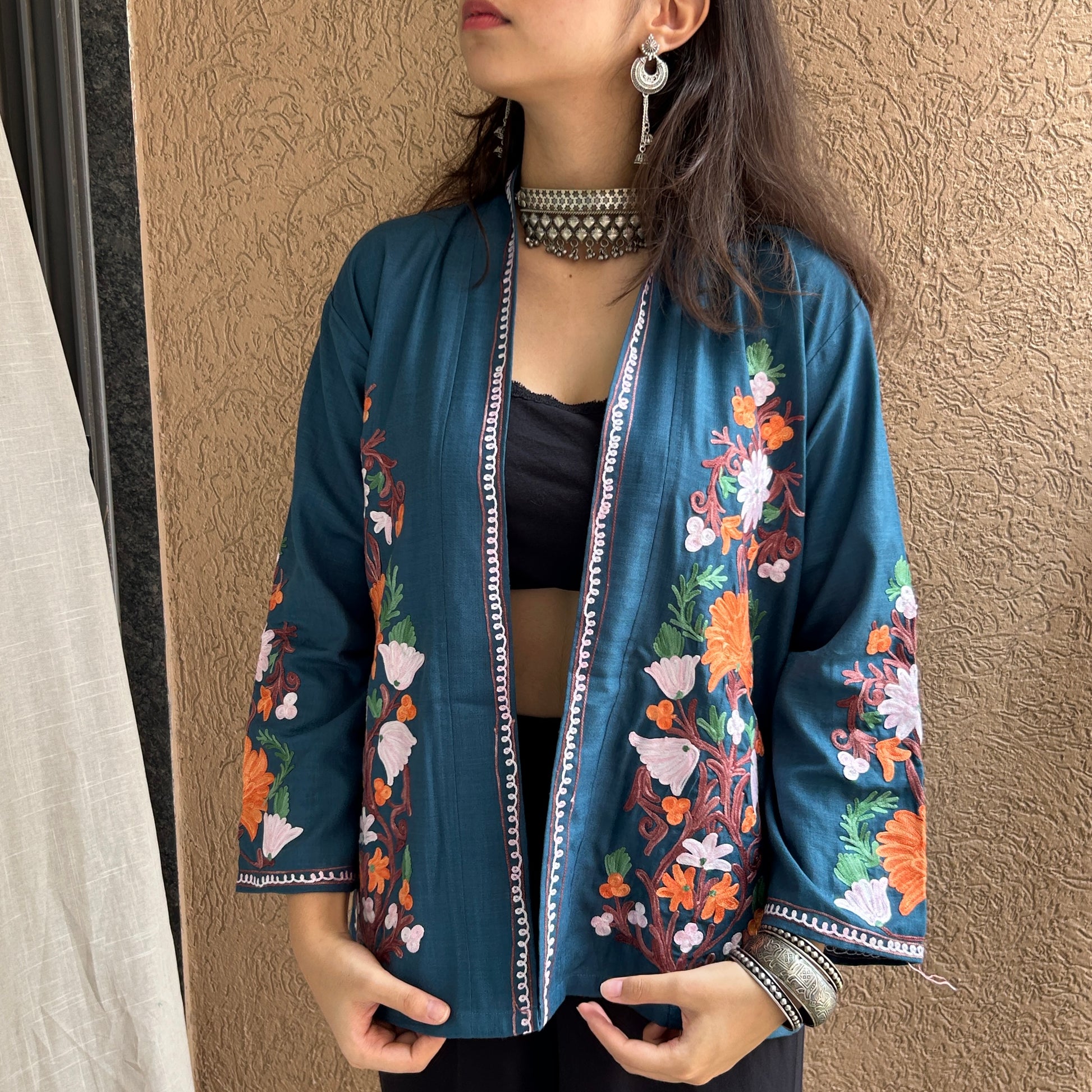 Designed with a contemporary silhouette, it layers effortlessly over both ethnic and Western wear; be it a kurta, dress, or denim. A versatile statement piece that adds charm and character to any outfit.