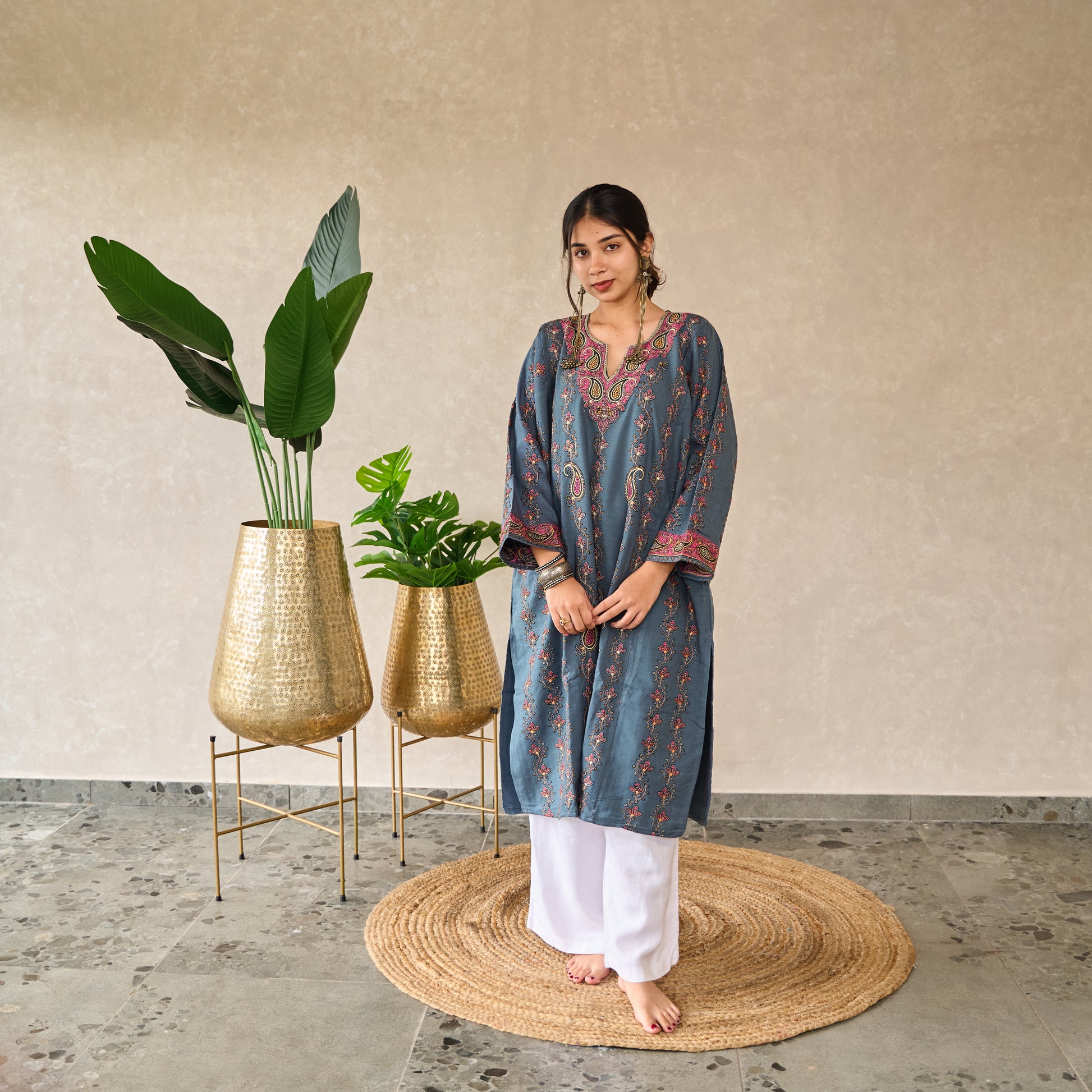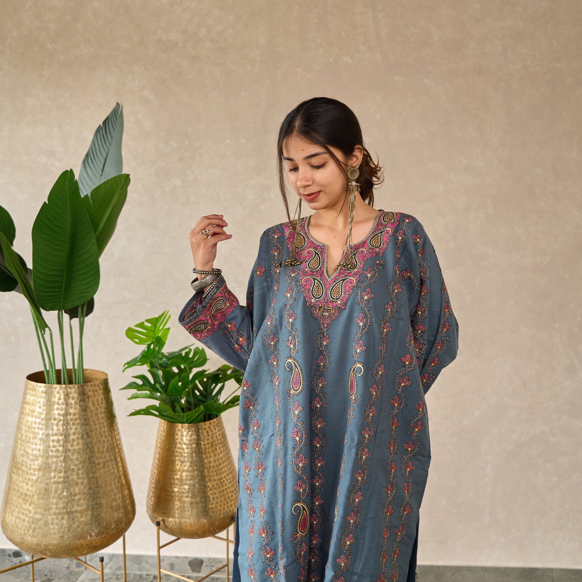 Embrace winter with our Kashmiri Sozni Embroidered Cashmilon Wool Blend Pheran.