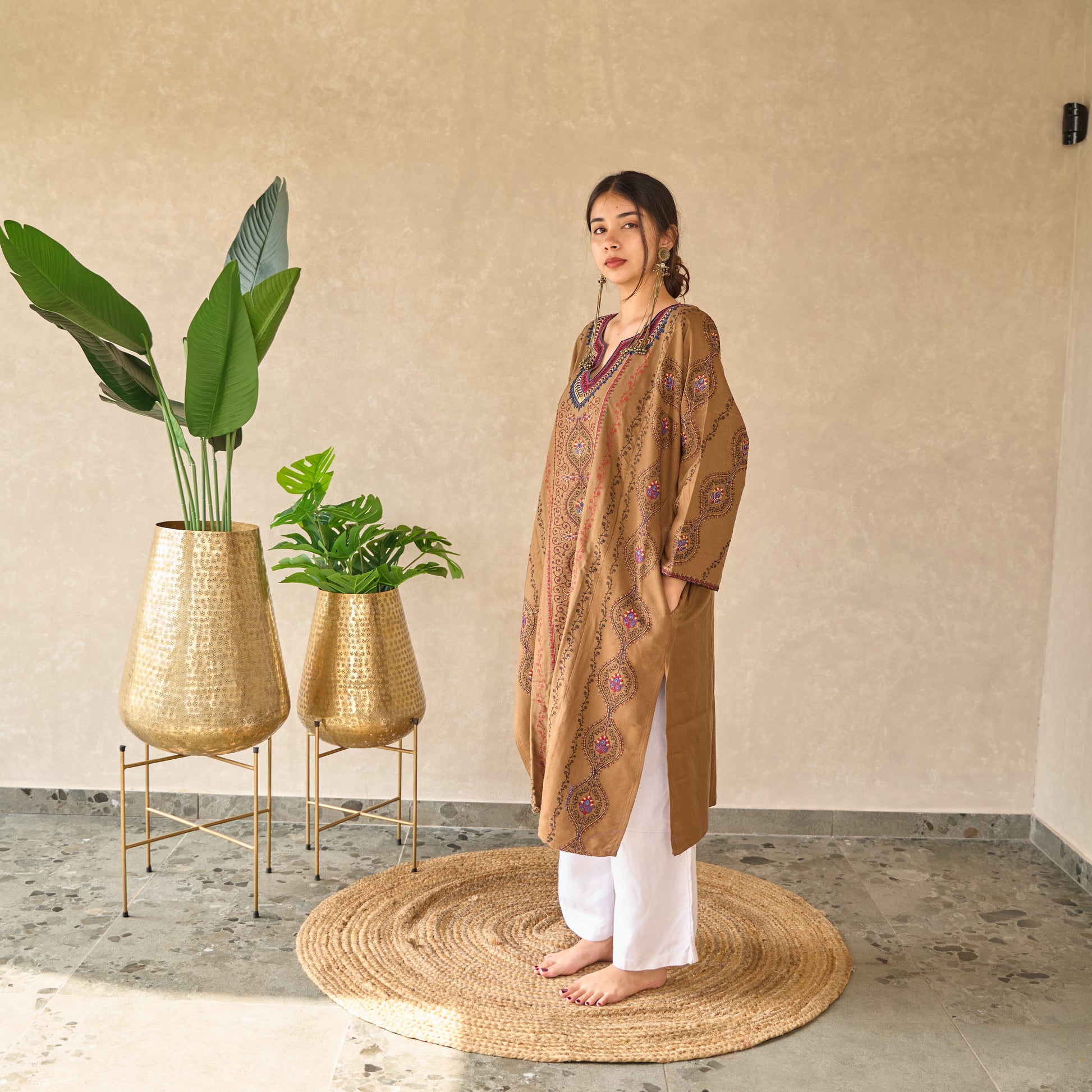Step confidently into winter’s grace with our Sozni Embroidered Kashmiri Cashmilon Pheran.
