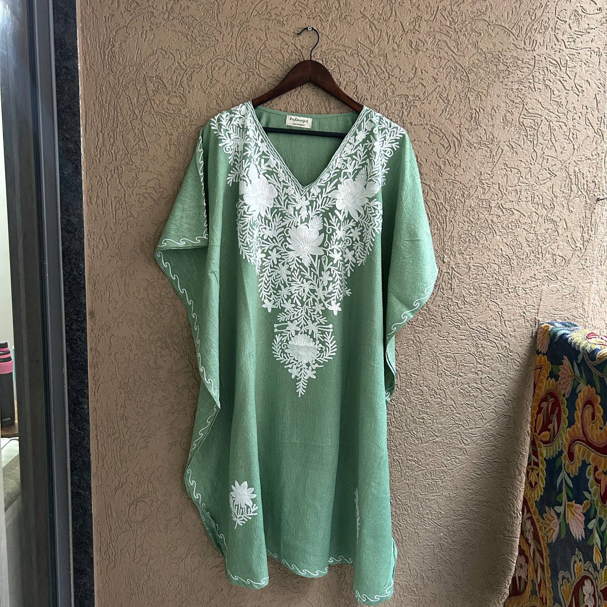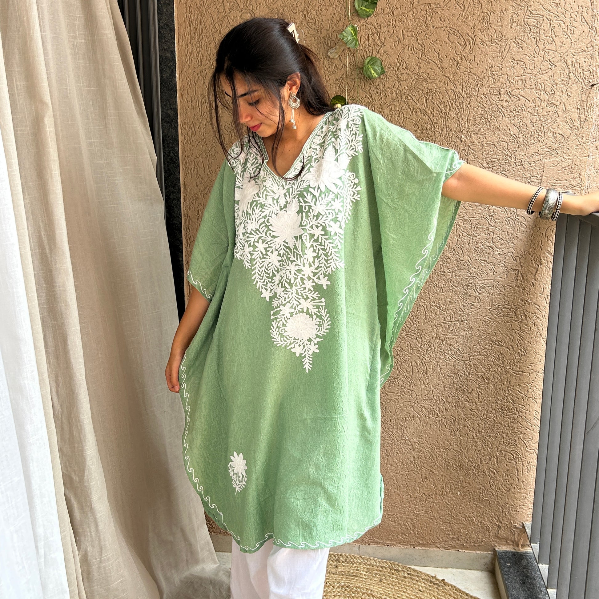 Look ethereal in this Aari work Kaftan Top, freshly crafted in the lightness and comfy feel of cotton. Proudly Made in Kashmir