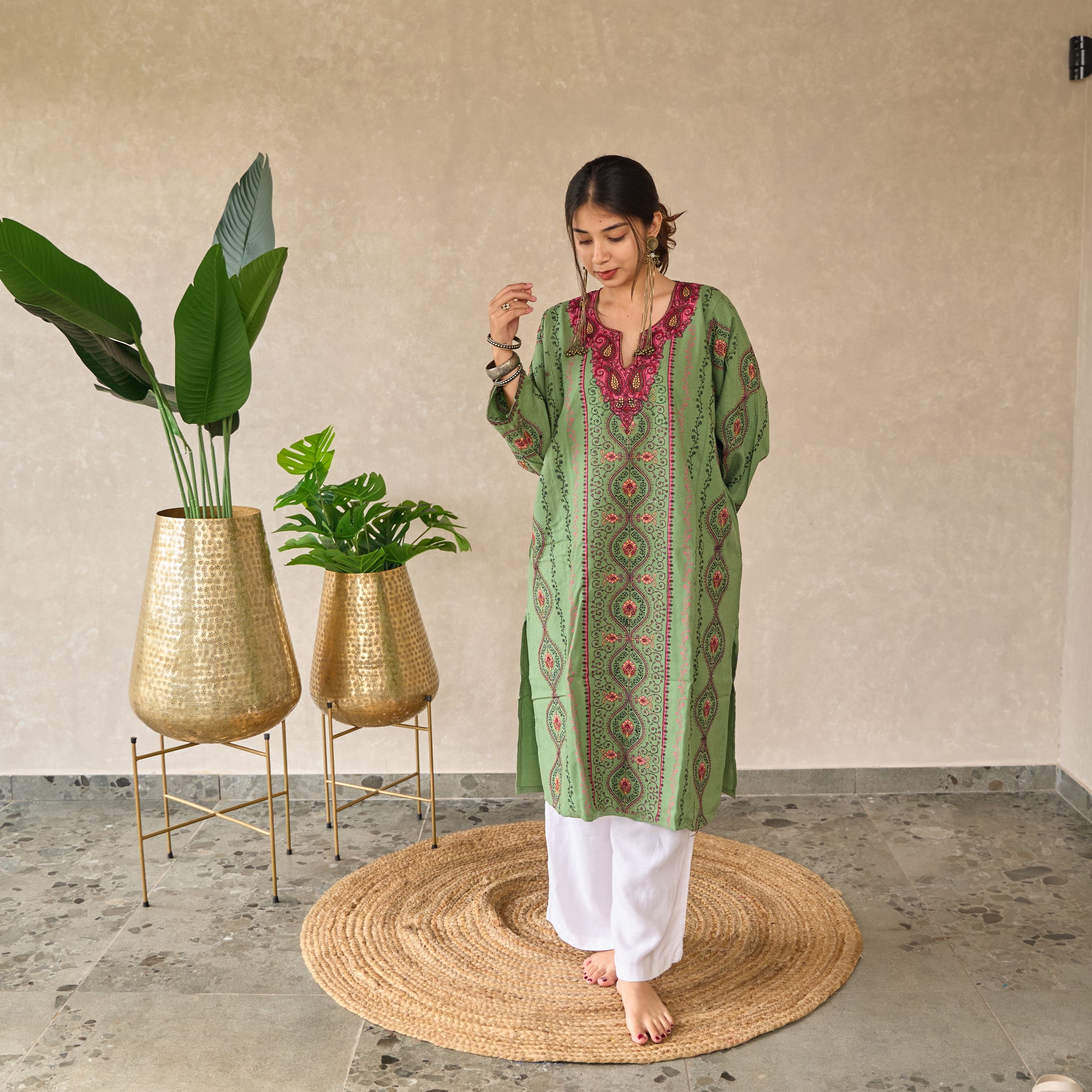 Embrace winter with our Kashmiri Sozni Embroidered Cashmilon Wool Blend Pheran.