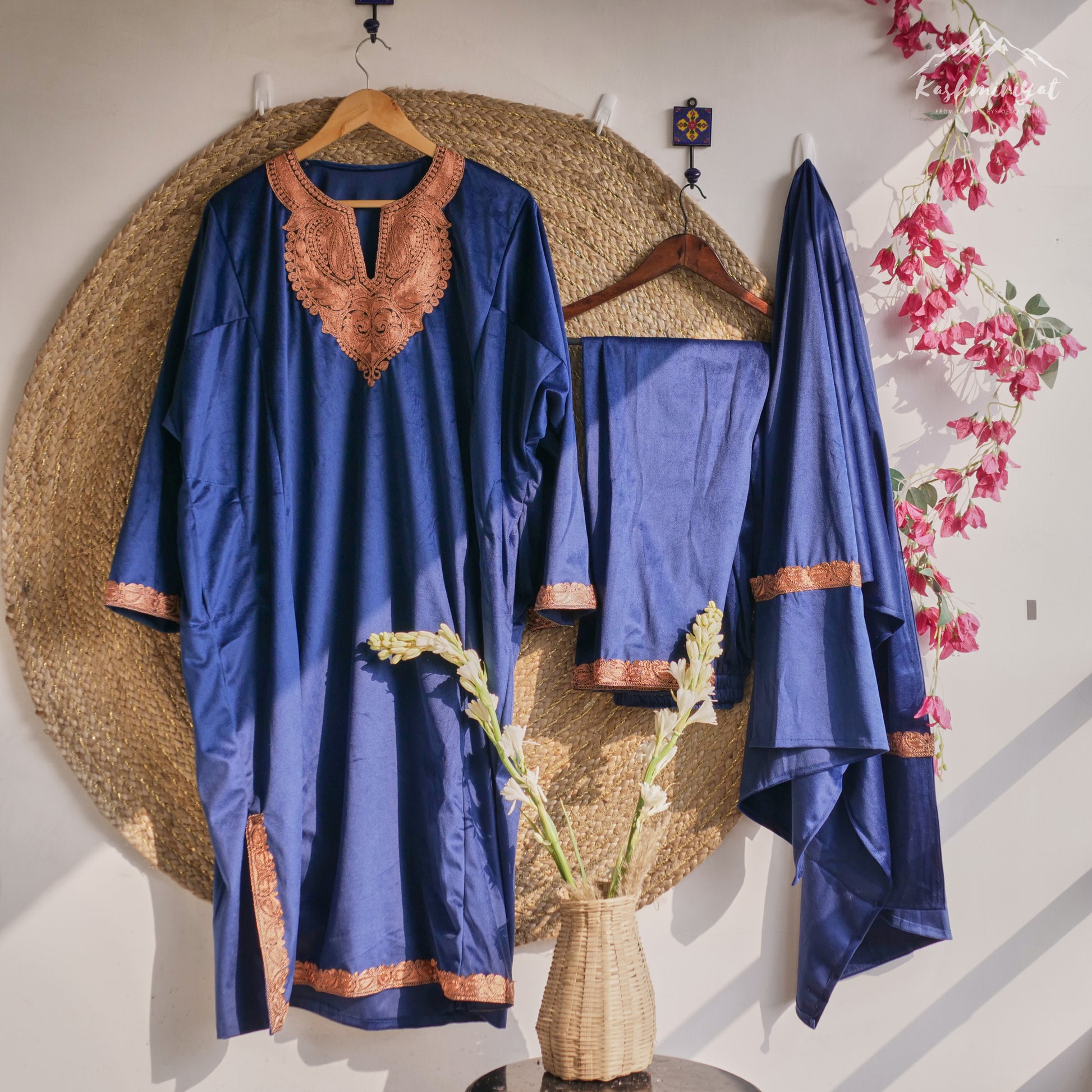 These full suits are super soft and cozy, made with premium quality velvet material adorned with pretty Aari embroidery. They're like a blend of tradition and modern style – perfect for any occasion, whether it's a special party or pre wedding occasions.