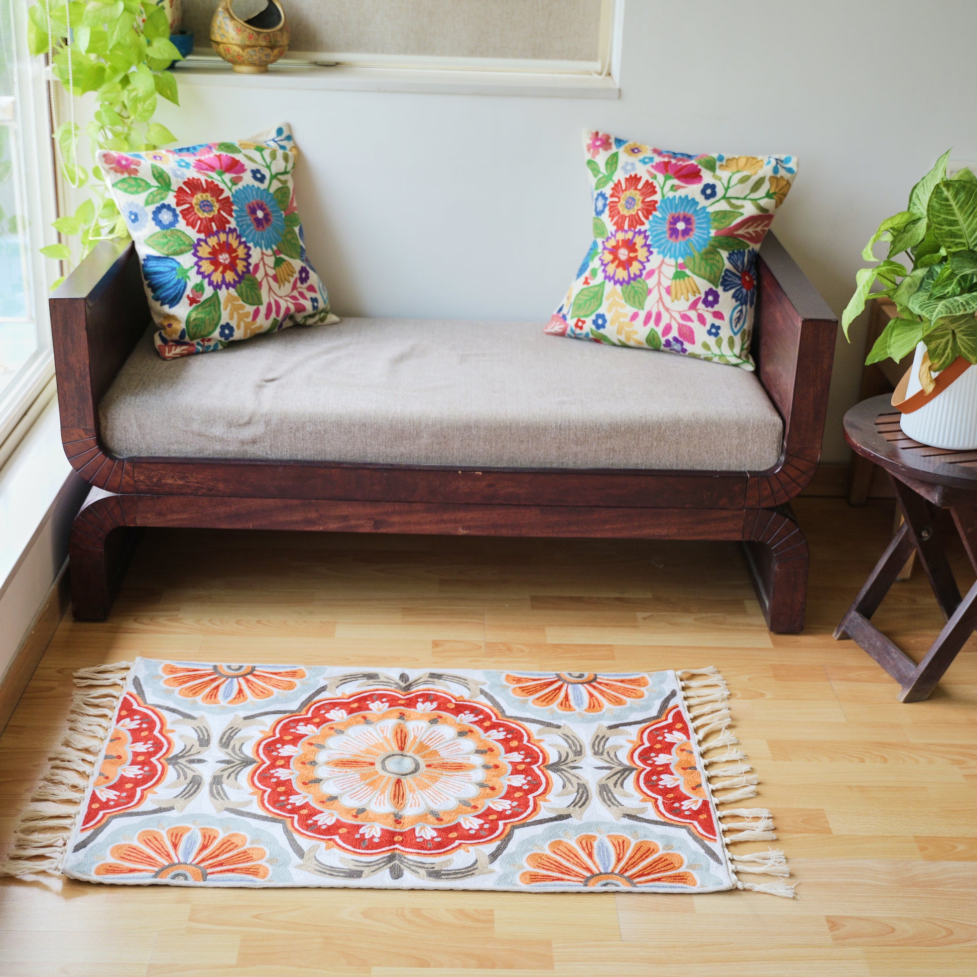 This beautiful handmade chain-stitch floor rug is made from wool thread embroidery on cotton base by our skilled craftsmen in Kashmir.