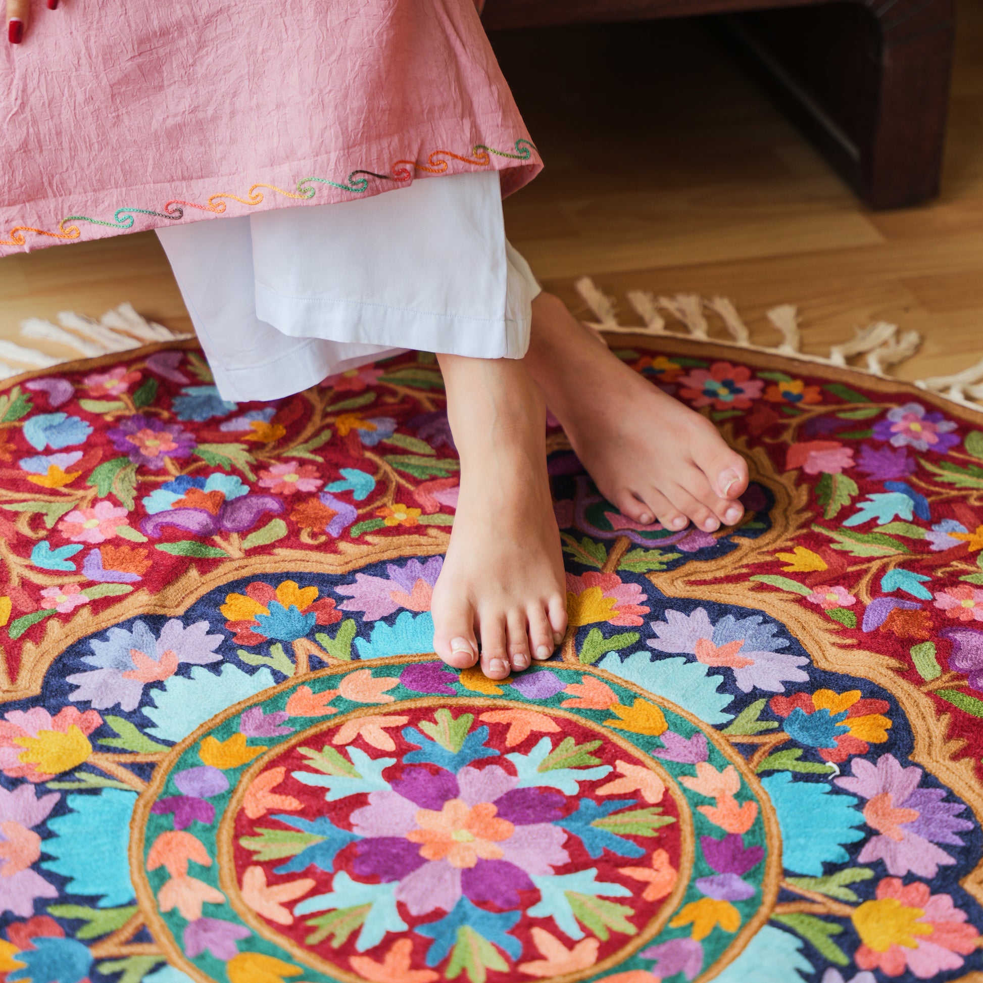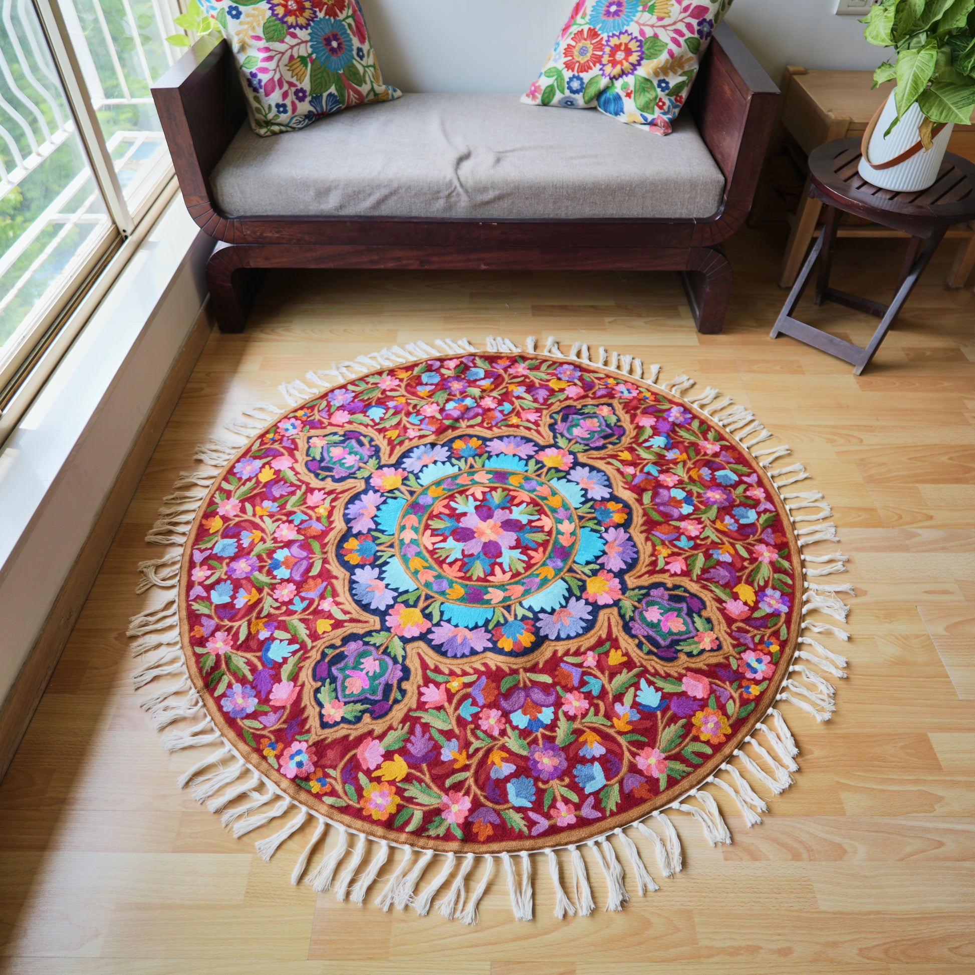 This beautiful handmade chain-stitch floor rug is made from wool thread embroidery on cotton base by our skilled craftsmen in Kashmir.