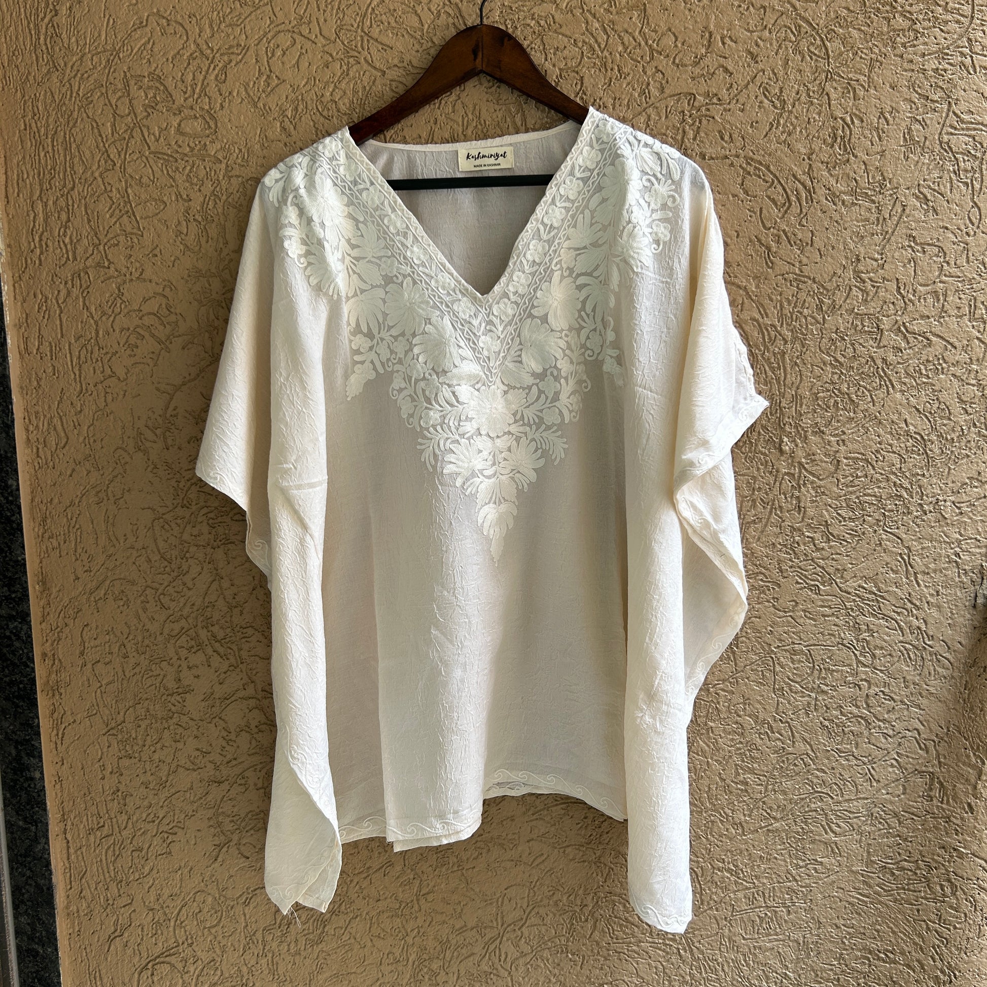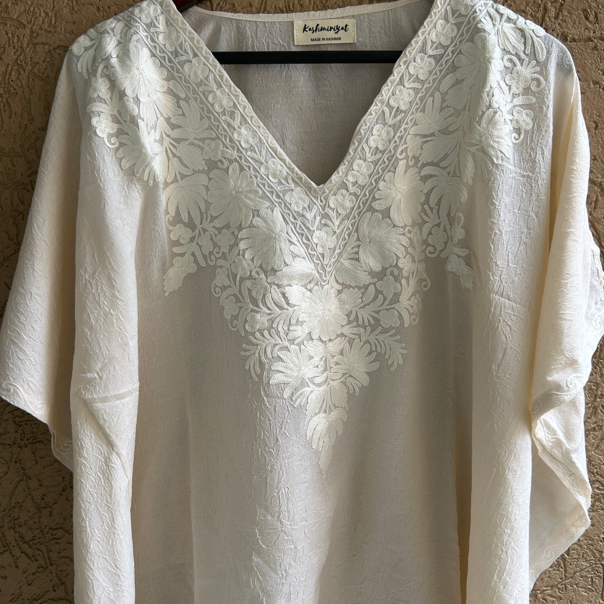 Look ethereal in this Aari work Kaftan Top, freshly crafted in the lightness and comfy feel of cotton. Proudly Made in Kashmir