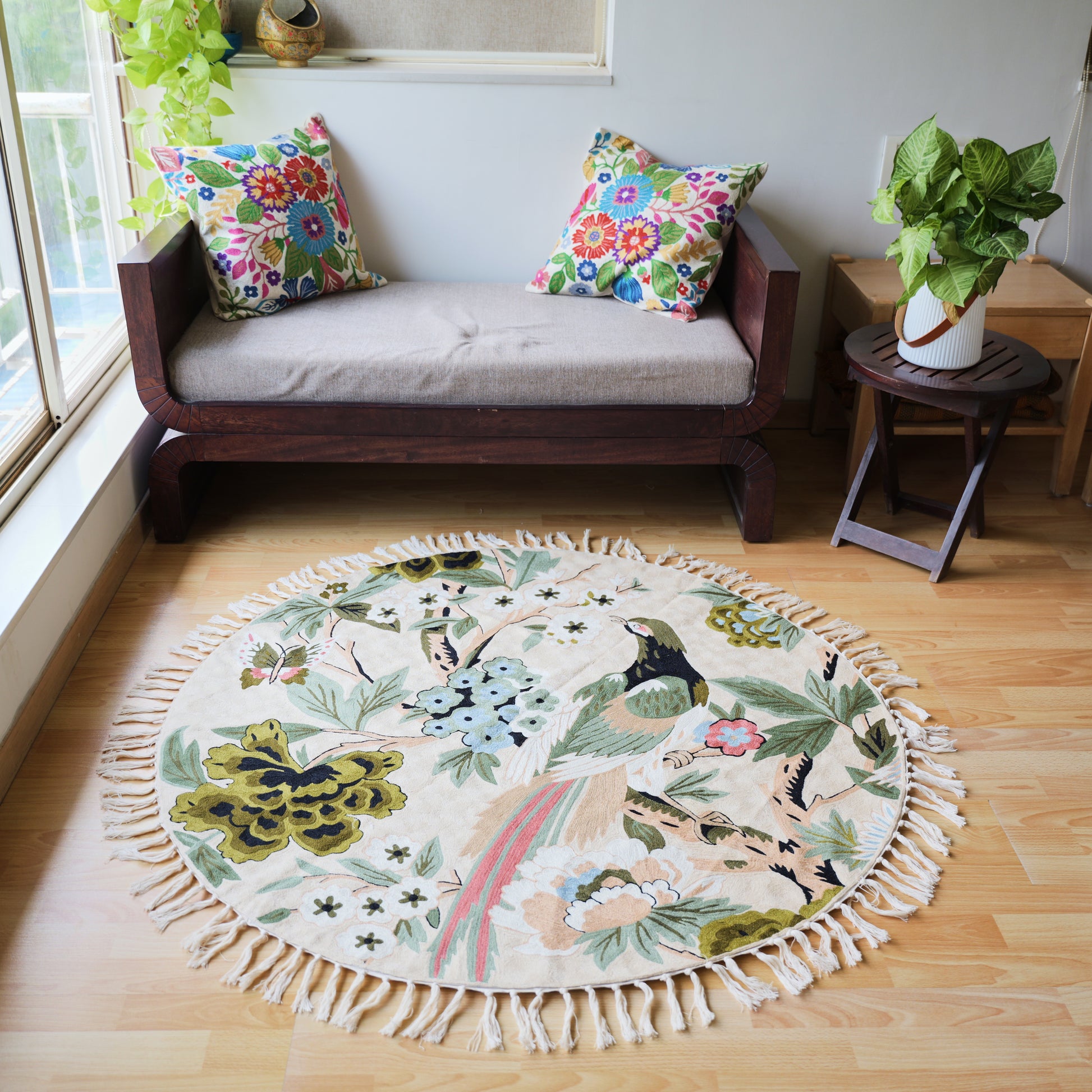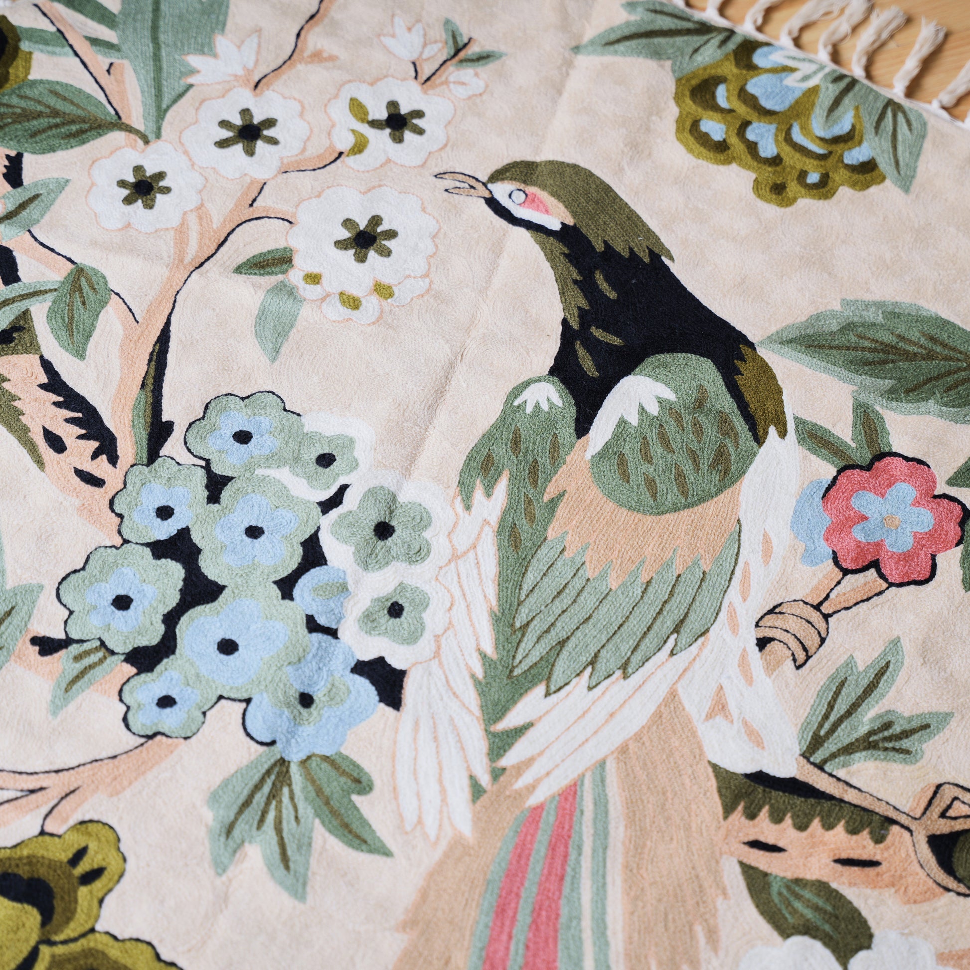 This beautiful handmade chain-stitch floor rug is made from wool thread embroidery on cotton base by our skilled craftsmen in Kashmir.