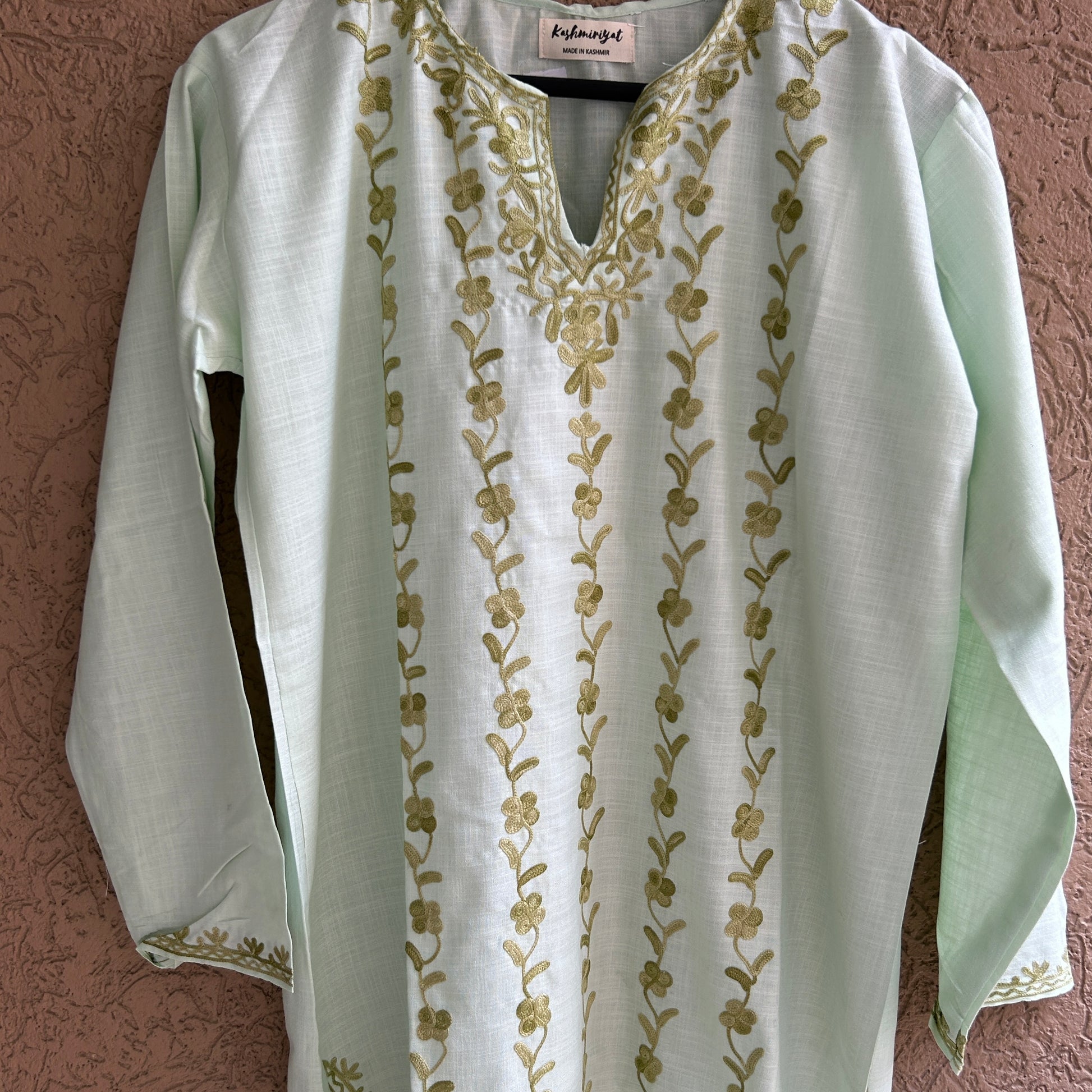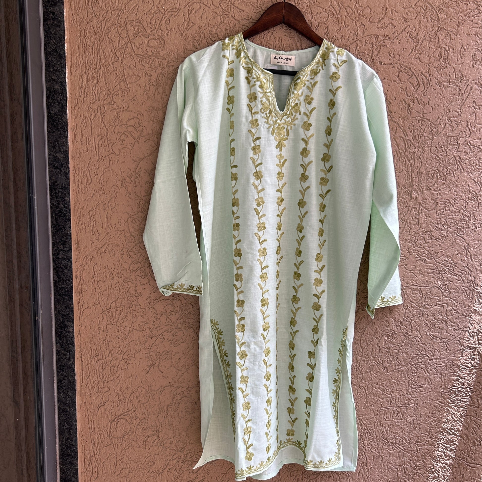 Pastel Green Cotton Kashmiri Kurti (Size 44)