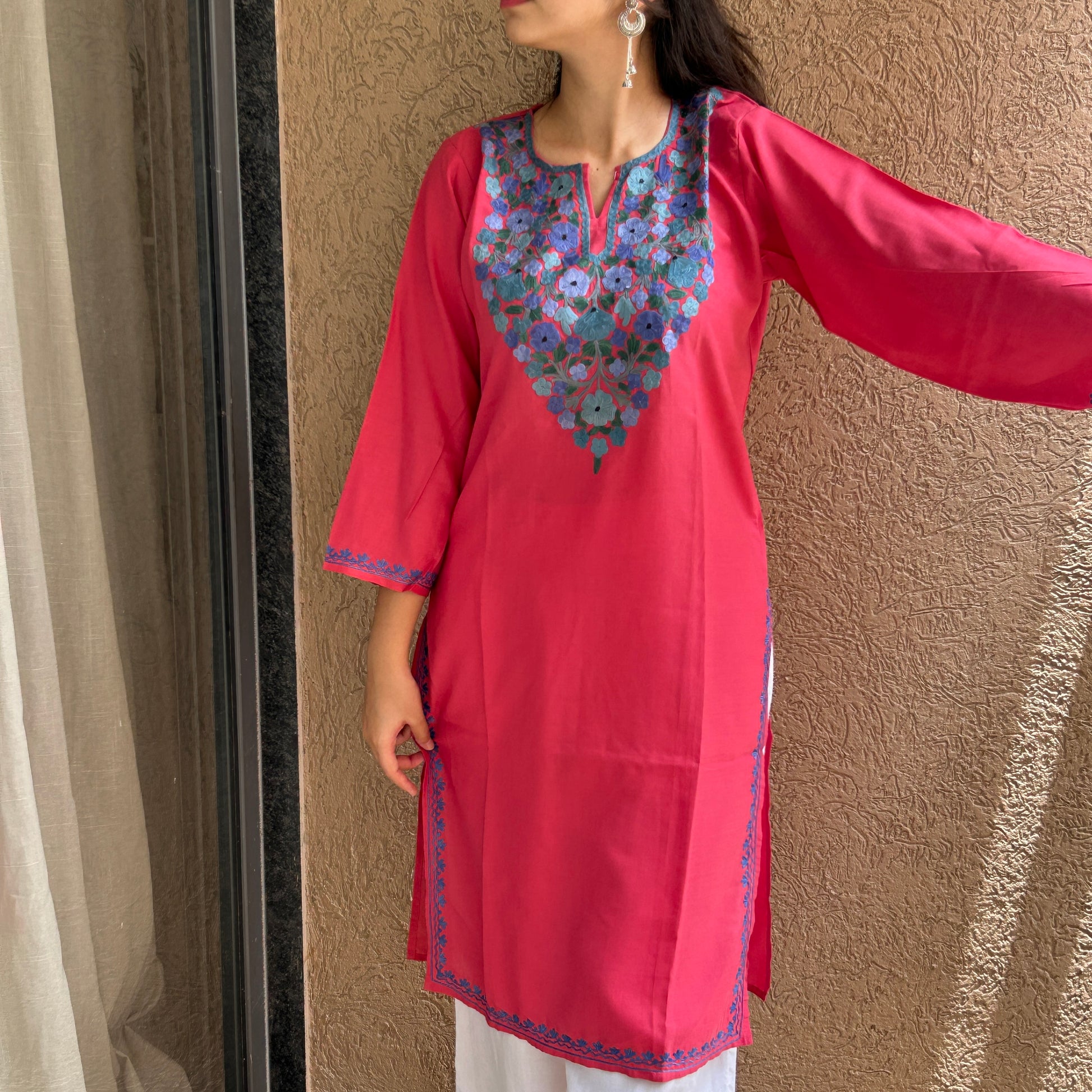 Pink & Blue Cotton Kashmiri Kurti (Size 42)