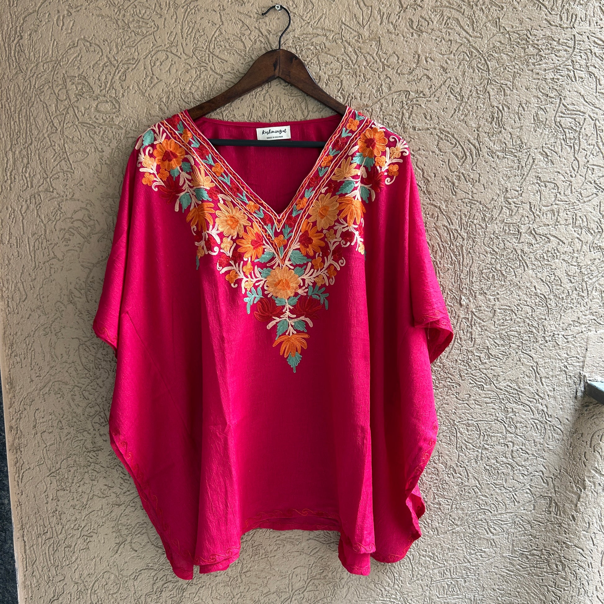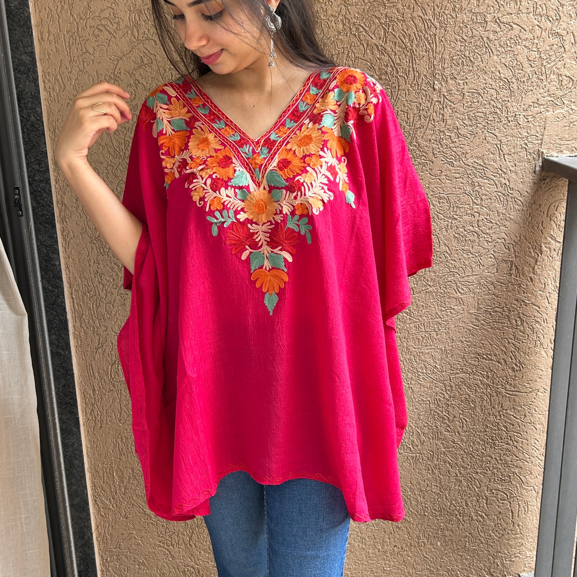 Look ethereal in this Aari work Kaftan Top, freshly crafted in the lightness and comfy feel of cotton. Proudly Made in Kashmir