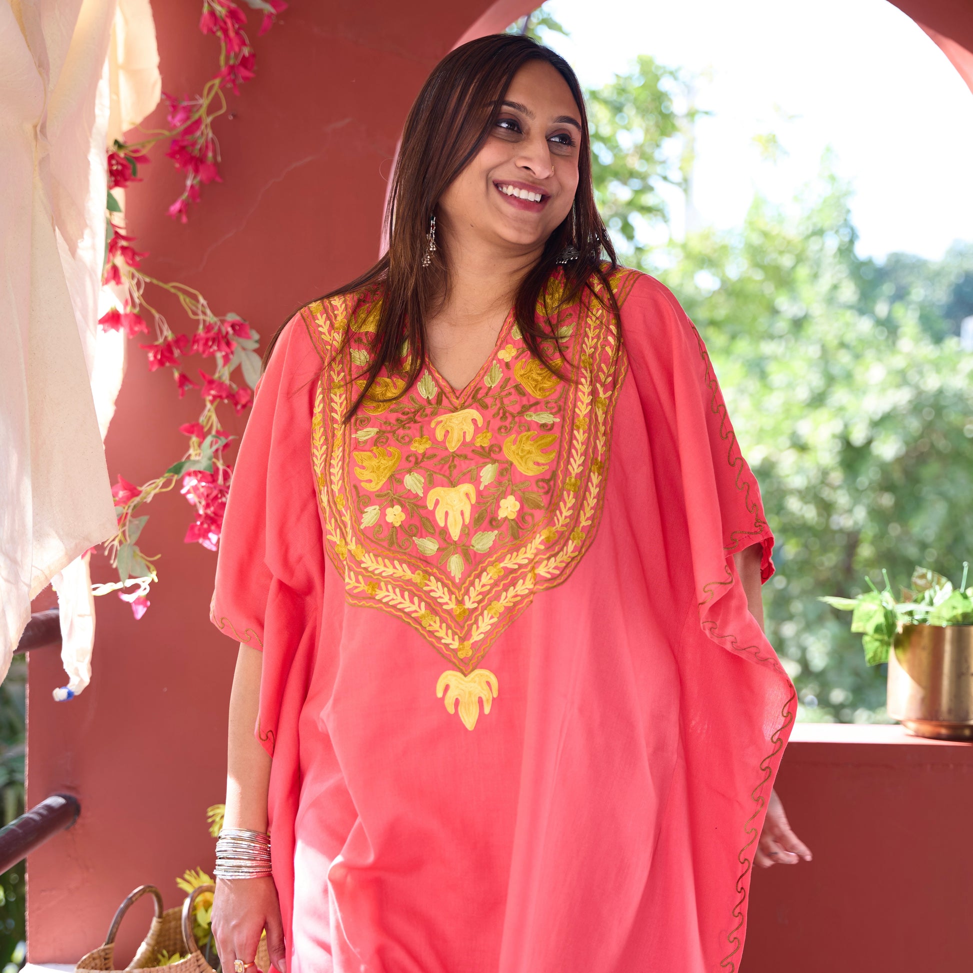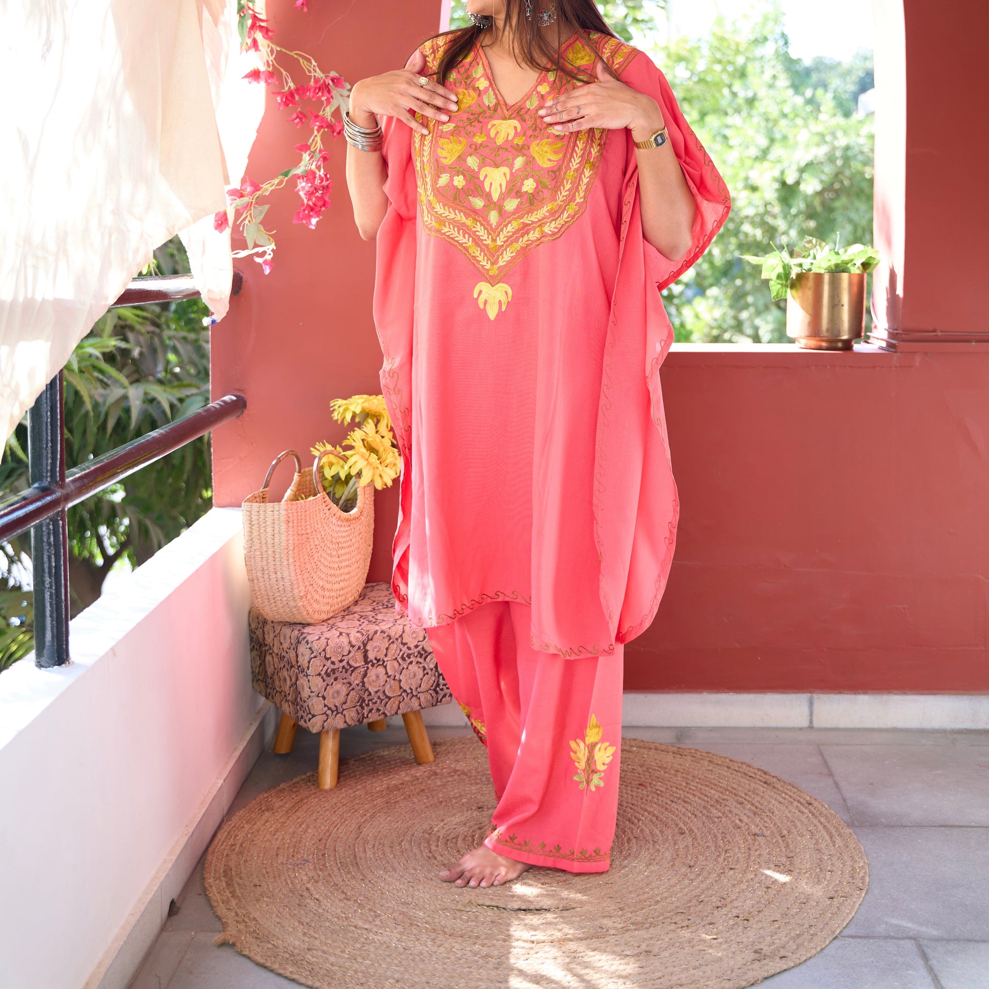 Our Kashmiri Kaftan Coord Sets seamlessly blend traditional craftsmanship with contemporary flair. The kaftan features exquisite Kashmiri embroidery, showcasing intricate patterns, while the coordinating pants provide a stylish and comfortable complement. This ensemble is the perfect choice for a variety of occasions, offering both elegance and ease.