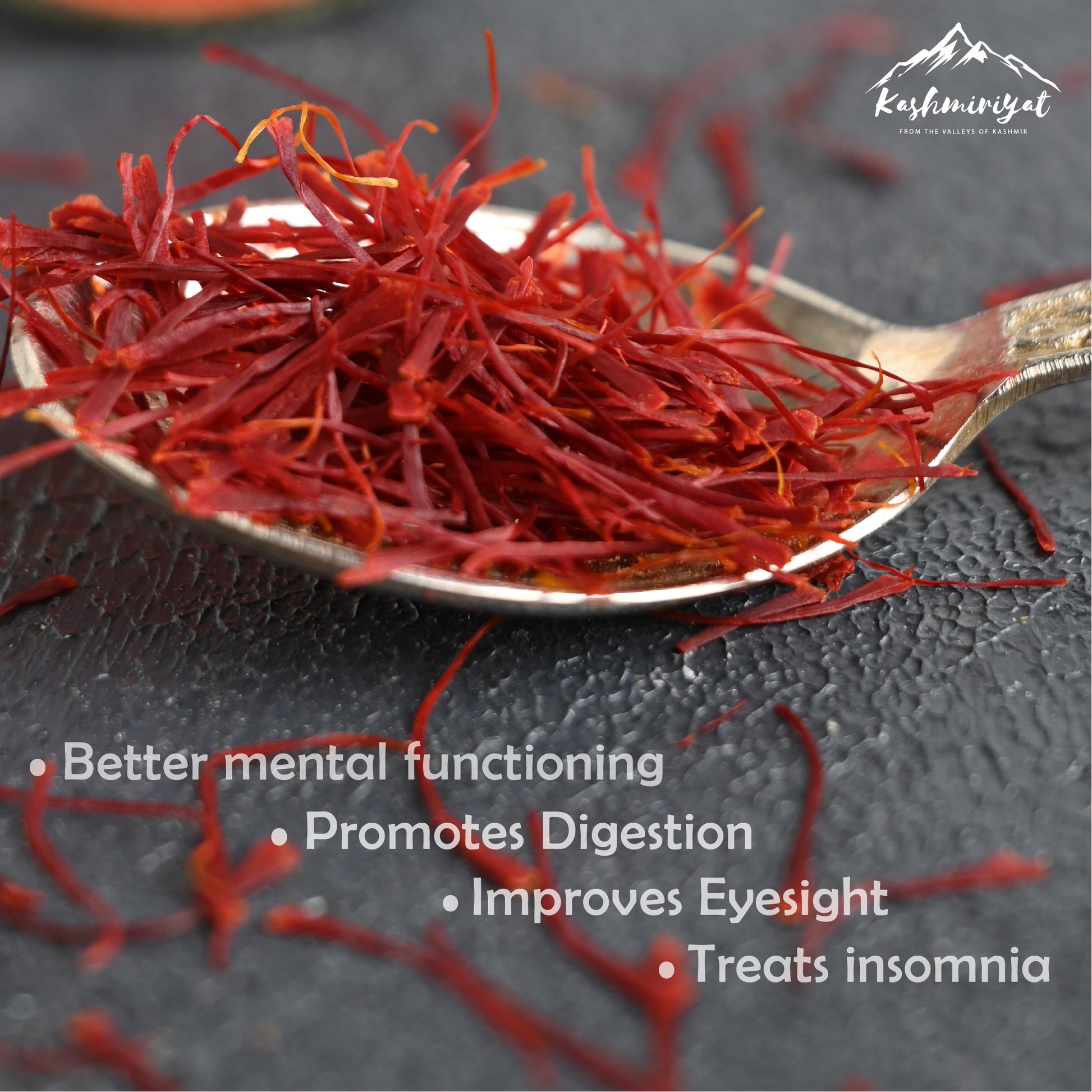 The saffron strands that we all are familiar with are basically the styles and stigma of the flower. The top part of a saffron strand is called Mogra which is flattened, dark red in colour which are collected and dried to be sold at prices of gold. Kashmiri saffron is the rarest and the most expensive form of saffron available in the world. Three compounds are responsible for giving kashmiri saffron its intense colour, aroma and a deep pungent taste. Pure Kashmiri Kesar, hand picked from farms in Kashmir to your doorstep!